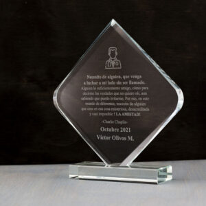 Galvano de cristal personalizado con grabado a laser. Incluye estuche de presentación azul con interior de paño de seda. Medida 220 x 160 x 15 mm.
