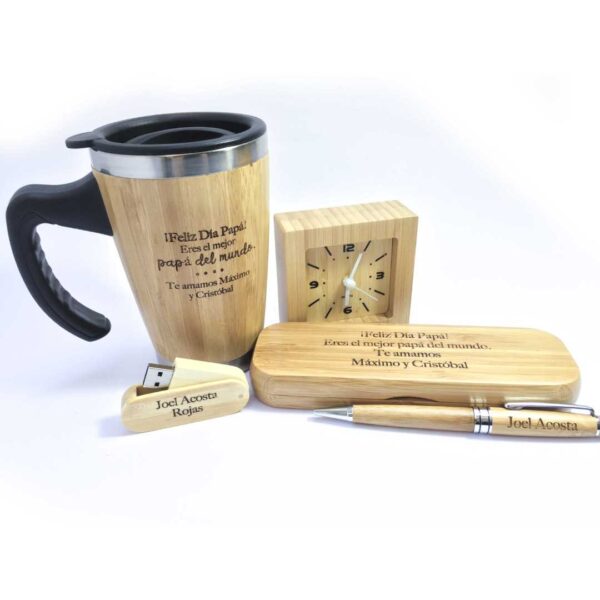 Mug térmico más reloj alarma, pendrive 8gb. Y bolígrafo con estuche en madera de bambú