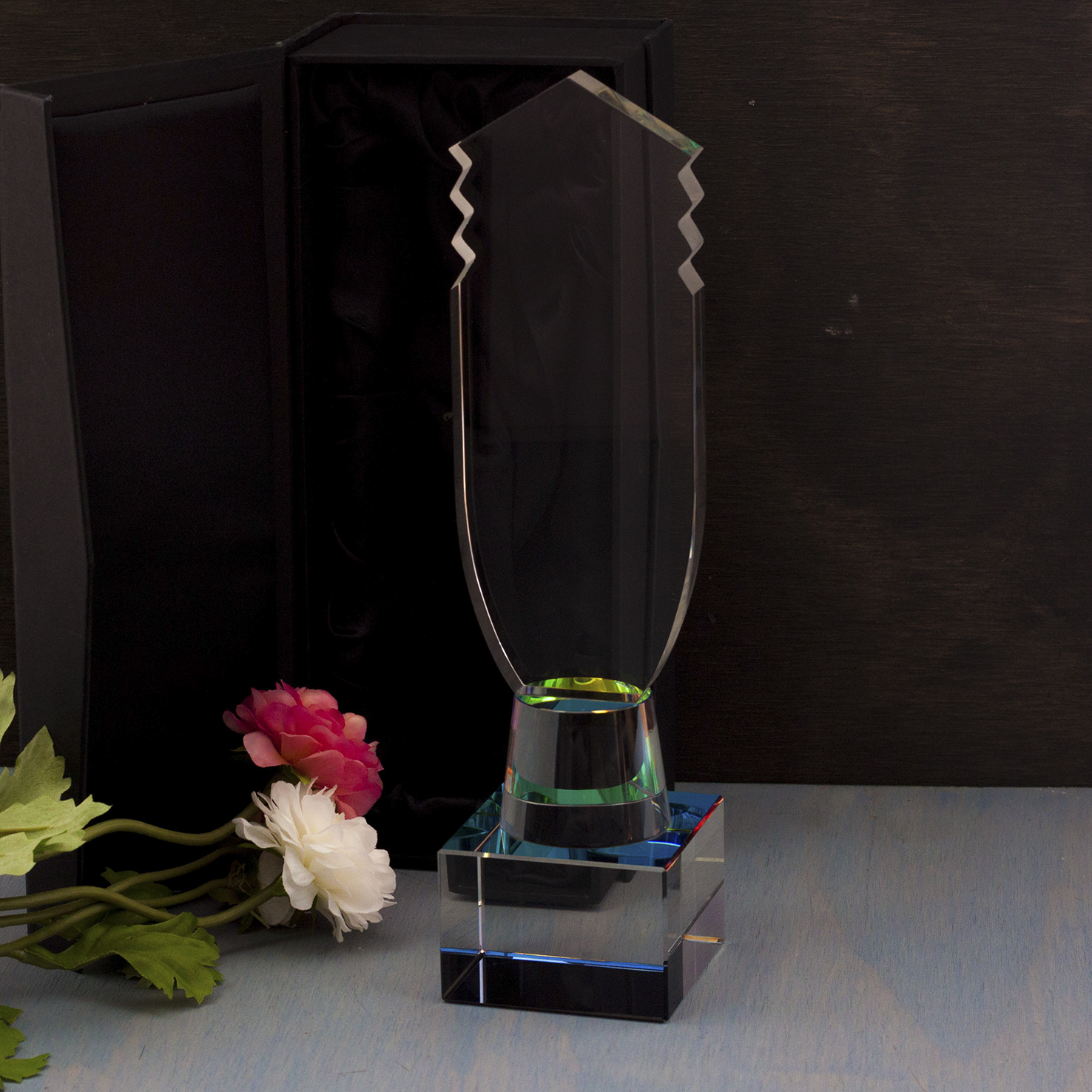 Galvano o testimonio cristal personalizado con reloj, redondo con base cristal y caja de presentación azul.